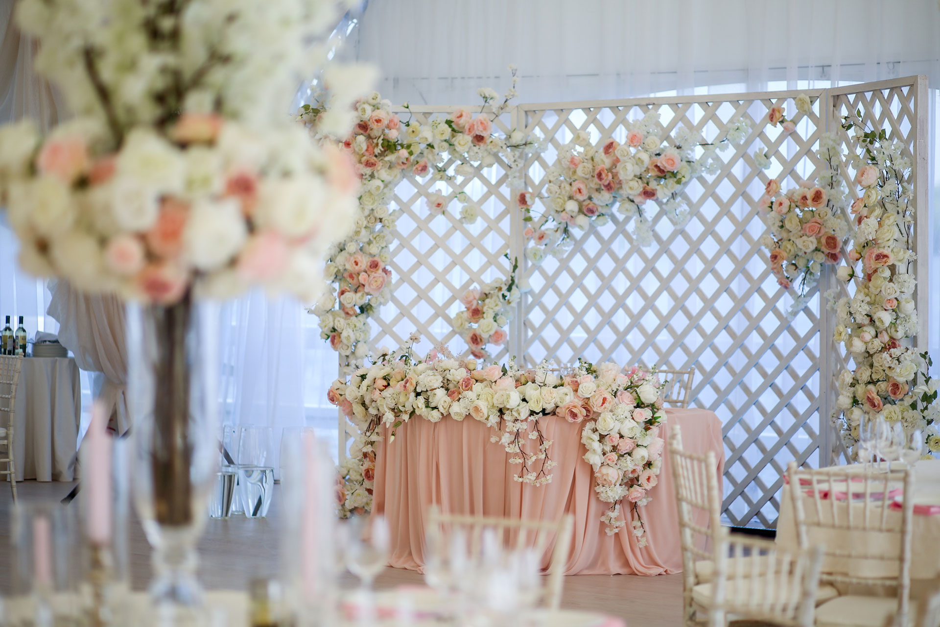 Украшение стола молодоженов элементами декора (вазы, свечи, кристаллы и т.д.)